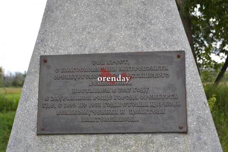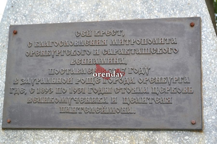 Возле большой поляны по-прежнему виден крест - очень красивый, ажурный. Надпись гласит, что крест с благословения митрополита Оренбургского и Саракташского Вениамина установлен в 2017 году в Зауральной роще города Оренбурга где с 1891 года по 1931 год стояла церковь великомученика и целителя Пантелеймона.