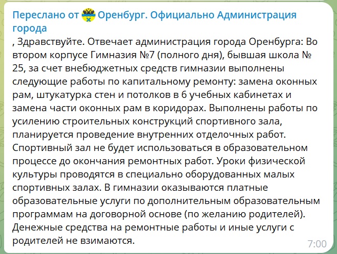Можно, пожалуйста, отремонтировать 25-ую школу (7-ая гимназия): стены на младшие классы сыпятся, каждый день ходим боимся трагедии. В спортзале дыры, зимой холодно. Окна родители за свой счет вынуждены делать, - возмущается оренбурженка. - Когда читаешь про такие шикарные школы, думаешь: чем мы хуже. Только начали учиться - уже по 19000 отдали на ремонт. Пожалуйста, обратите внтмание на школы в центре!