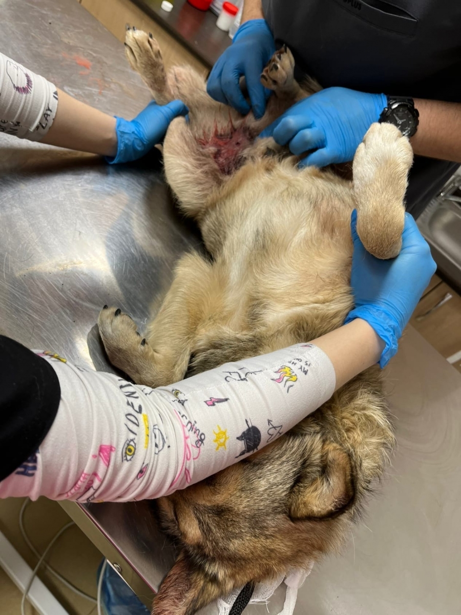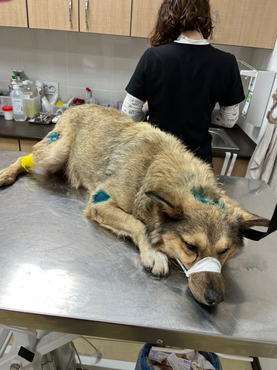 Поздним вечером волонтер, узнавший о беде, произошедшей с бездомным хвостиком, бросив все дела, отвезла пса в клинику. Там многочисленные раны собаки обработали и зашили.