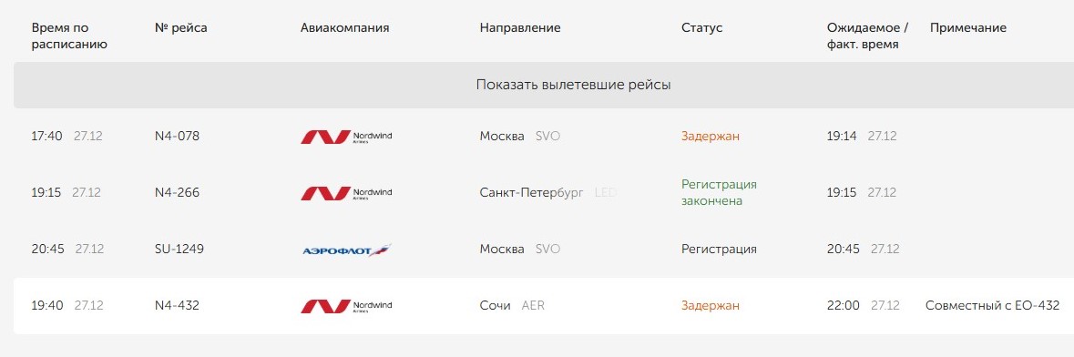Сегодня, 27 декабря, изменилось расписание двух рейсов авиакомпании Nordwind Airlines, согласно данным электронного табло аэропорта. Рейс N4-078 в Шереметьево вместо запланированного времени вылета в 17:40 отправится в 19:14. Ранее он был перенесён на 18:35, но, вероятно, погодные условия внесли свои коррективы, и рейс снова пришлось отложить. Также задерживается вылет в Сочи — теперь самолёт вылетит не в 19:40, а в 22:00. Причиной стала задержка прибытия авиалайнеров в Оренбург.