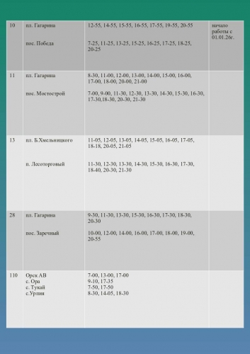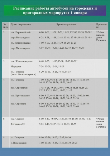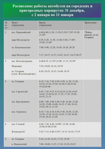 Так, в первый день нового года, 1 января 2026 года, ряд автобусных маршрутов (№ 4, 6, 10, 11, 13, 28) начнут свою работу позже установленного времени. С 2 по 11 января 2026 года на всех муниципальных маршрутах будет применяться временное расписание.