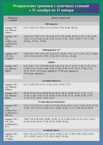 Администрация города Орска уведомляет жителей о корректировке графика работы муниципального транспорта в период с 31 декабря 2025 года по 11 января 2026 года.