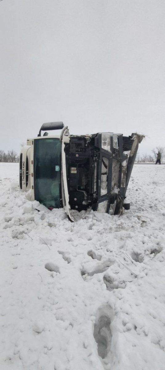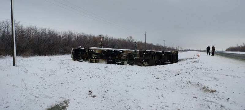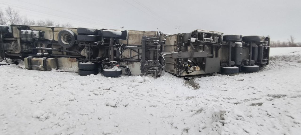 Предварительно установлено, что водитель автомобиля МАН не учел дорожные и метеорологические условия и съехал в левый по ходу движения кювет, где фура опрокинулась на правую сторону.