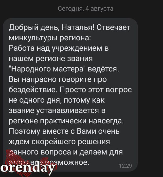 Работа над учреждением в нашем регионе звания «Народный мастер» ведется. Вы напрасно говорите про бездействие. Просто это вопрос не одного дня, так как звание устанавливается в регионе практически навсегда. Поэтому вместе с вами ждем скорейшего решения этого вопроса и делаем для этого всё возможное, - в очерендной раз отписались чинвники.