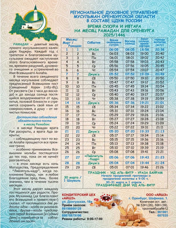 Региональное духовное управление мусульман Оренбургской области опубликовало точное время ифтара и сухура в месяц Рамадан. Мы публикуем календарь восходов и заходов солнца для удобства постящихся.