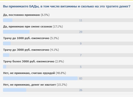 Более половины опрошенных россиян (59 процентов) постоянно принимают витамины и другие биологически активные добавки (БАД) на постоянной основе. Об этом свидетельствуют результаты опроса онлайн-сервиса по управлению здоровьем Budu и международного логистического оператора СДЭК. Согласно результатам опроса, проведенного на нашем сайте, таких в Оренбургской области всего 6,5 процентов.
