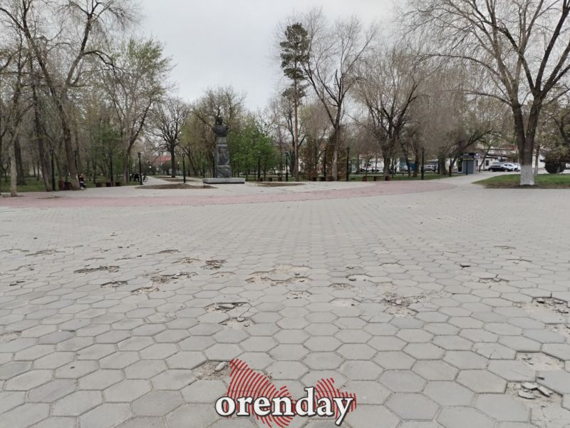 Но что там какие-то дворы в Степном поселке, если даже центр города не везде презентабельно выглядит. Прогулялись мы по парку Перовского - тротуарная плитка местами напрочь разбита и отсутствует, табличка капсулы времени с посланием потомкам - вся в пыли, на ограждении клумб у той же капсулы - старая отшелушивающаяся краска, и ни одного посаженного или проросшего цветочка, но не считая, конечно, одуванчиков. Только потрескавшаяся земля в листве да торчащие, еще не ожившие черенки роз.