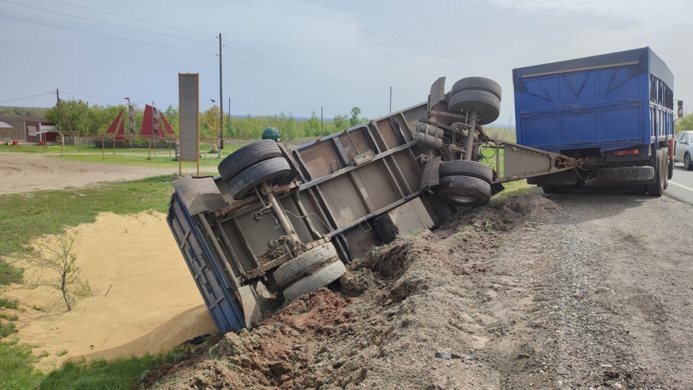 В результате прицеп большегруза перевернулся, и зерно оказалось в кювете. К счастью, жертв получилось избежать, пострадал только перевозимый груз.
