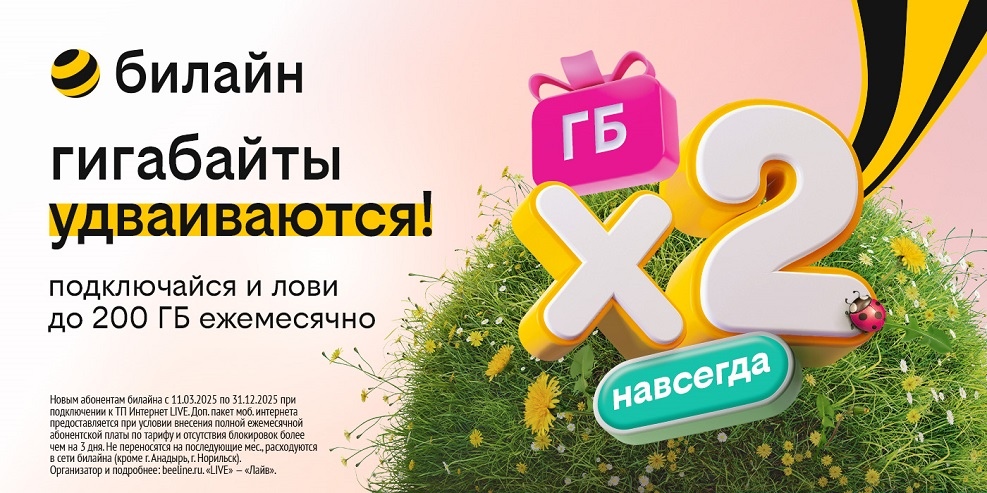 С тарифом «Интернет Live» от билайна вам не нужно тянуть провода или устанавливать сложное оборудование — просто раздайте интернет со смартфона или подключите сим-карту к Wi-Fi-роутеру. А чтобы интернета было достаточно, оператор запустил акцию по удвоению гигабайт: выбираете пакет на 60 или 100 ГБ и мобильный интернет будет удваиваться бесплатно ежемесячно.