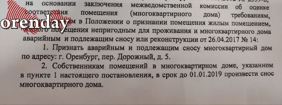 Центральный районный суд Оренбурга признал незаконным бездействие управления жилищно-коммунального хозяйства администрации Оренбурга, департамента имущественных и жилищных отношений администрации города и самой мэрии в части неисполнения постановления администрации Оренбурга от 15 сентября 2020 года «Об изъятии земельного участка и других объектов недвижимости для муниципальных нужд» и возложил обязанность на департамент имущественных и жилищных отношений администрации города и на мэрию изъять земельный участок в целях сноса аварийного дома до 31 декабря 2024 года. Также необходимо было расселить людей до этого же периода.