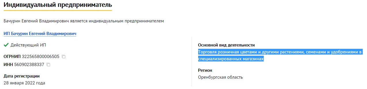 Кроме того, в открытых источниках сказано, что полный тезка Бачурина является в областном центре с 2022 года индивидуальным предпринимателем, который занимается розничной торговлей цветами и другими растениями, семенами и удобрениями в специализированных магазинах.
