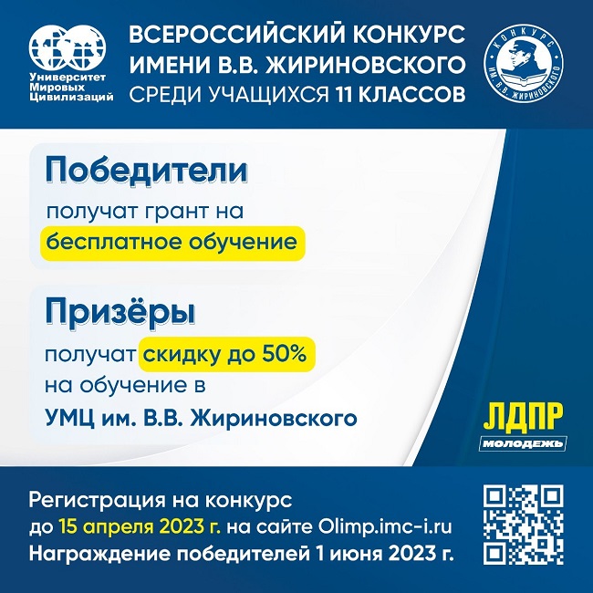 Участники Первого Всероссийского конкурса имени В.В. Жириновского смогут выбрать одно из 13 направлений для обучения в Университете мировых цивилизаций. Среди профилей подготовки – бизнес-информатика, реклама и связи с общественностью, государственное и муниципальное управление и другие востребованные специальности.