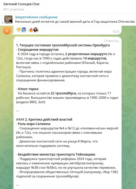 Евгений Александрович, обратите внимание на важный момент - Оренбург нуждается в закупке новых троллейбусов. Мэр города Салмин неоднократно пытался "убить" троллейбусное движение в областном центре, сократив 2 маршрута - номер 4 и 12 - до половины маршрута. В нищие 90-е годы в нашем городе было аж 14 троллейбусных маршрутов, обслуживались новые и отдалённые районы города как Южный, Карачи, Ростоши..