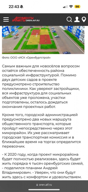 Уважаемый Евгений Александрович, помогите нам в решении данного вопроса, ведь мы покупали жилье в микрорайоне "Времена года’" поверив, в том числе, и вашим коллегам, что район полностью будет готов, обеспечен социальной инфраструктурой, об этом твердили во всех сми, вот, например, прилагаю статью 2017 года в "Аргументах и фактах". Т.е уже с 2017 года семьи ждут в том числе и обещанный детский садик, поликлинику и парковую зону. И еще в 2020 году планировали полностью реализовать этот проект микрорайона.