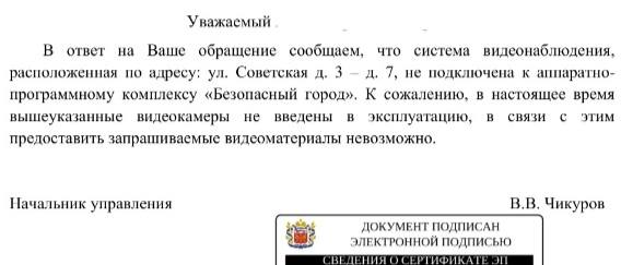 «Я обратился в администрацию с просьбой предоставления видео, но получил отказ. Оказалось, камеры не введены в эксплуатацию!» - сообщил удивлённый этим фактом горожанин.