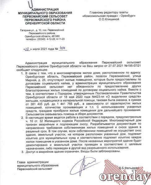 Всё в той же администрации МО "Первомайский сельсовет" Первомайского района корреспондентам Orenday сообщили, что дом аварийный и подлежит сносу (правда, о том, когда именно было принято соответствующее решение межведомственной комиссией, не указали). Чиновники уже почти два года заняты одним из своих любимых занятий – «разрабатывают документацию». Ждут, что ли, что сам рухнет или сгорит?