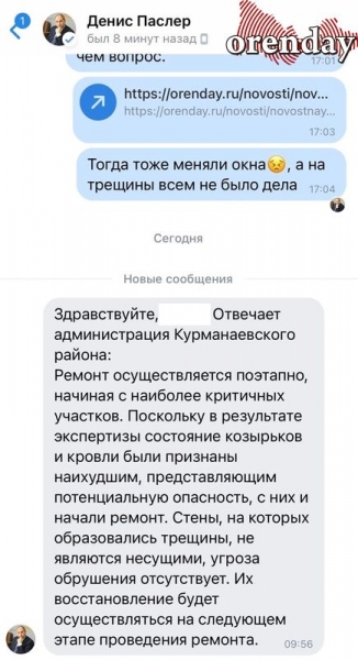 Мамы и папы неоднократно обращались с просьбой привести в порядок садик и в местный отдел образования, и к главе Курманаевского района Василию Саулину, и даже к губернатору Оренбургской области Денису Паслеру. Все их мольбы о помощи оказались не услышанными. Их лишь успокаивают ответом, что стены - не несущие, и, мол, опасности нет.