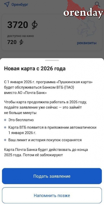 С 1 января 2026 года в программе "Пушкинская карта" произойдут изменения - поменяется оператор. Обслуживать "культурную карту" будет банк ВТБ (ПАО). Ранее контролем и выпуском карты занимался АО "Почта Банк".