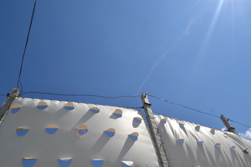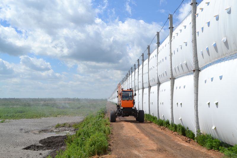 Внедрил «Росводоканал Оренбург» и свою разработку, установив по периметру иловых полей своеобразный парусный забор с системой туманообразования, где на высоте шести метров в круглосуточном режиме подаются реагенты.