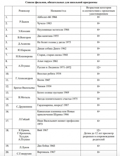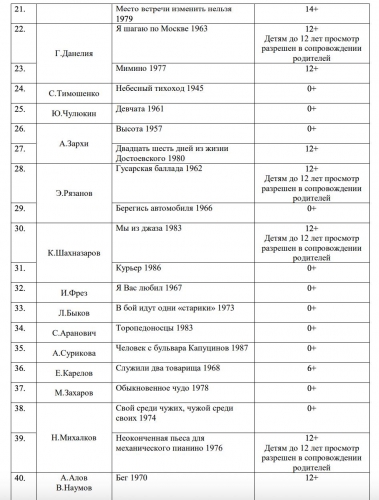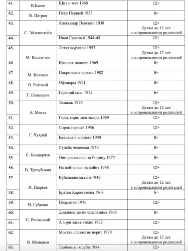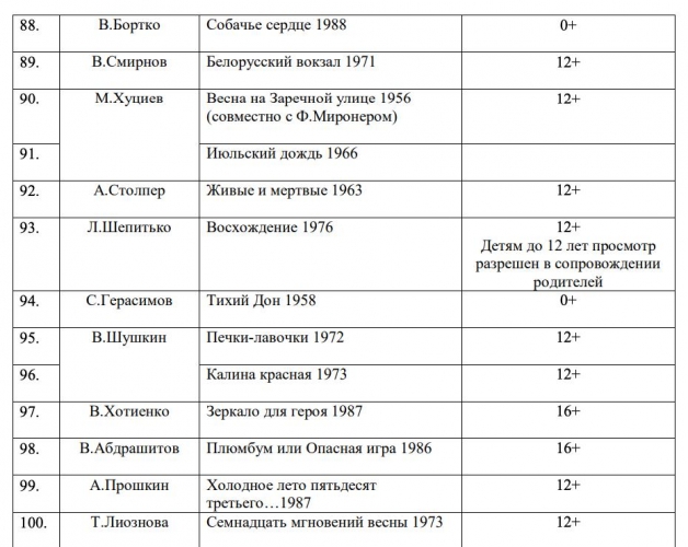 В список вошли исключительно советские киноленты, среди которых можно выделить такие произведения, как «Чучело» (0+), «Белое солнце пустыни» (0+), «Тихий Дон» (0+) и «Семнадцать мгновений весны» (12+). Полный перечень представлен ниже.