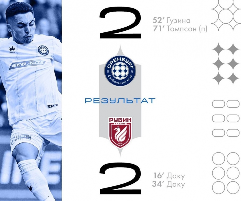 Оставшуюся часть игры оренбуржцы судорожно пытались исправить ситуацию. И, можно сказать, им это удалось – 2:2. С таким счётом завершилась встреча. Голы забили Хорди Томпсон и Гедеон Гузина.