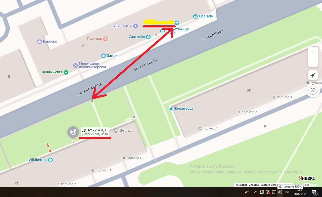 Однако фактически здание, на первом этаже которого располагается детское образовательное учреждение, удалено от улицы Богдана Хмельницкого на несколько сотен метров, а вот улица Аксакова находится у него под окнами.
