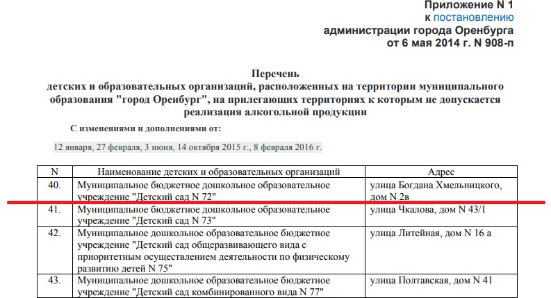 Сам же детский сад значится в постановлении администрации города Оренбурга от 6 мая 2014 г. N 908-п "Об утверждении перечня детских и образовательных организаций и схем границ прилегающих территорий к детским и образовательным организациям, на которых не допускается реализация алкогольной продукции":