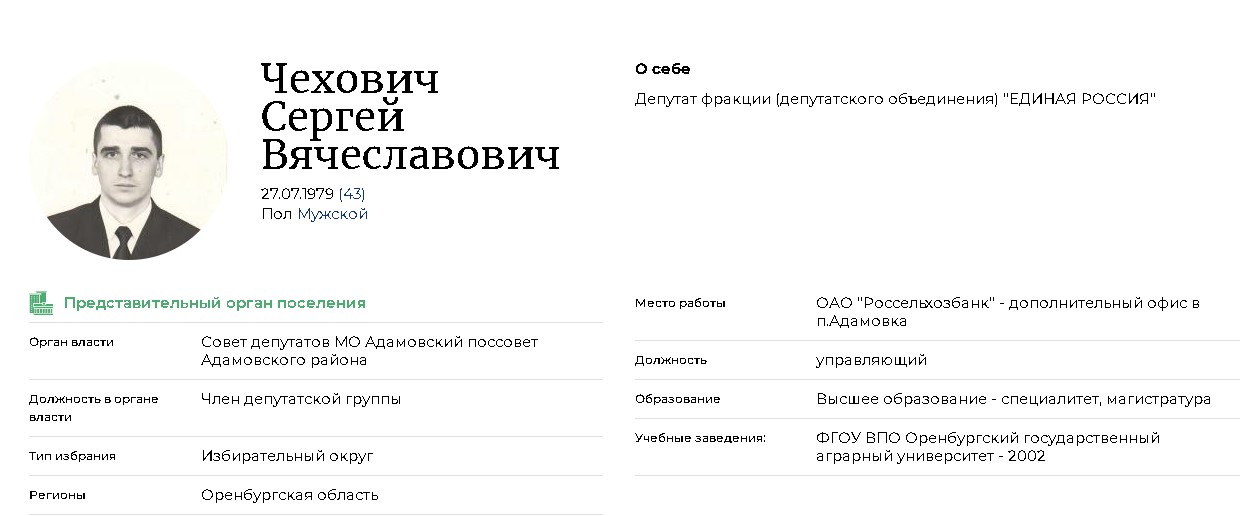 В соответствии с Федеральным законом от 06 октября 2003 года № 131-ФЗ «Об общих принципах организации местного самоуправления в Российской Федерации», Законом Оренбургской области от 21 февраля 1996 года «Об организации местного самоуправления в Оренбургской области», решением Совета депутатов муниципального образования Адамовский район от 01 июня 2022 года № 146 «Об утверждении Положения «О порядке проведения конкурса по отбору кандидатур на должность главы муниципального образования Адамовский район Оренбургской области и избрания на должность главы муниципального образования Адамовский район Оренбургской области», руководствуясь статьями 20, 24 Устава Адамовского района, Совет депутатов муниципального образования Адамовский район РЕШИЛ: Избрать главой муниципального образования Адамовский район Оренбургской области Чеховича Сергея Вячеславовича, - уточнили в администрации района.