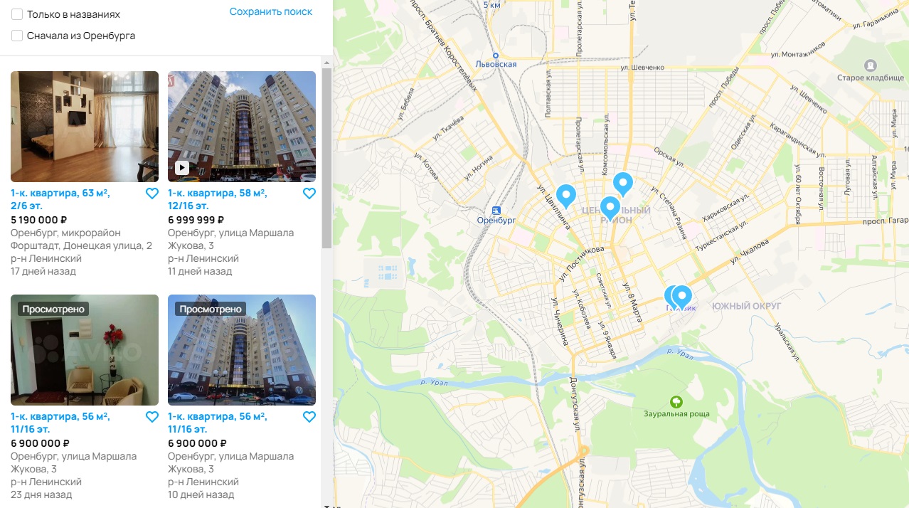 В центральной части Оренбурга представлены на выбор покупателей еще две квартиры по цене выше пяти миллионов рублей: на Терешковой, в районе пригородного автовокзала – за пять миллионов двести тысяч (54 кв.м., 11/11 эт.) и на Донецкой – за пять миллионов сто девяносто тысяч рублей (63 кв.м., 2/6 эт.).