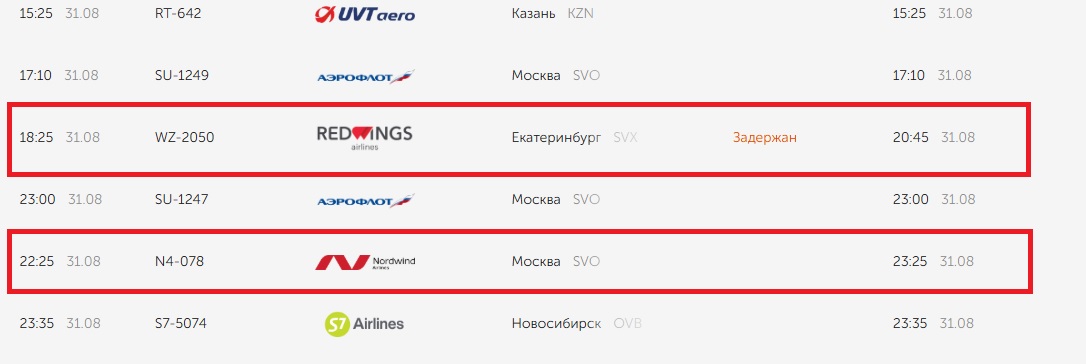 Пассажирам рейса Оренбург-Екатеринбург и Оренбург-Москва придется подождать вылета, так как рейсы задерживаются. Это видно по расписанию вылетов в аэропорту. Сообщается, что вылет в Екатеринбург задерживается на 2 часа 20 минут. Вылет по расписанию должен был состояться в 18:25, но перенесен на 20:45. Рейс в Москву перенесли только на час – вместо 22:25 самолет вылетит к месту назначения в 23:25.
