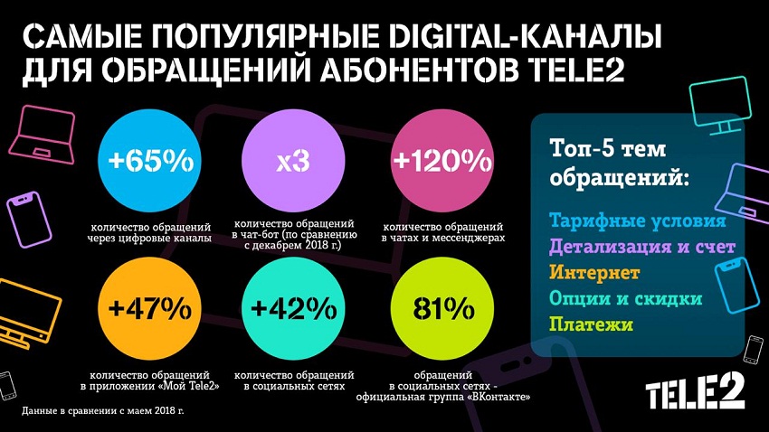 Tele2 фиксирует рост обращений в группах Tele2 в социальных сетях: по итогам мая 2019 года их число увеличилось на 42% год к году. При этом предпочтительной соцсетью остается «ВКонтакте» – на группу поддержки здесь приходится 81% обращений, в то время как «Одноклассники» и Facebook занимают доли в 5,2% и 4% соответственно.