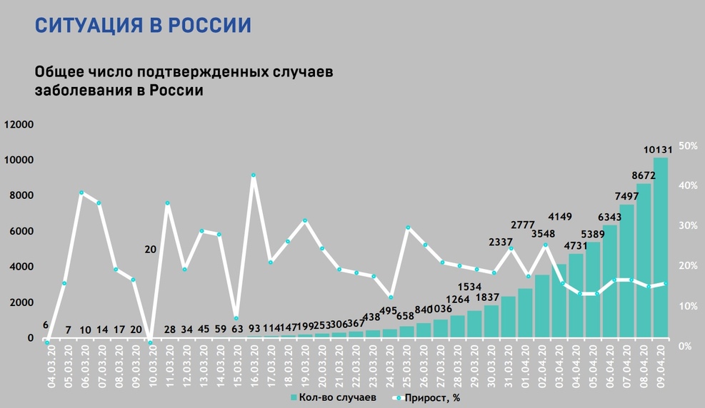 На сегодня в России зарегистрирован уже 10 131 случай заражения новым видом коронавируса. К сожалению, в последние дни количество зарегистрированных заболеваний резко возросло. За последние сутки было подтверждено 1459 новых заболевших, и это – новый рекорд. День назад число новых пациентов за сутки было равно 1175, два дня назад – 1154-м пациентам.