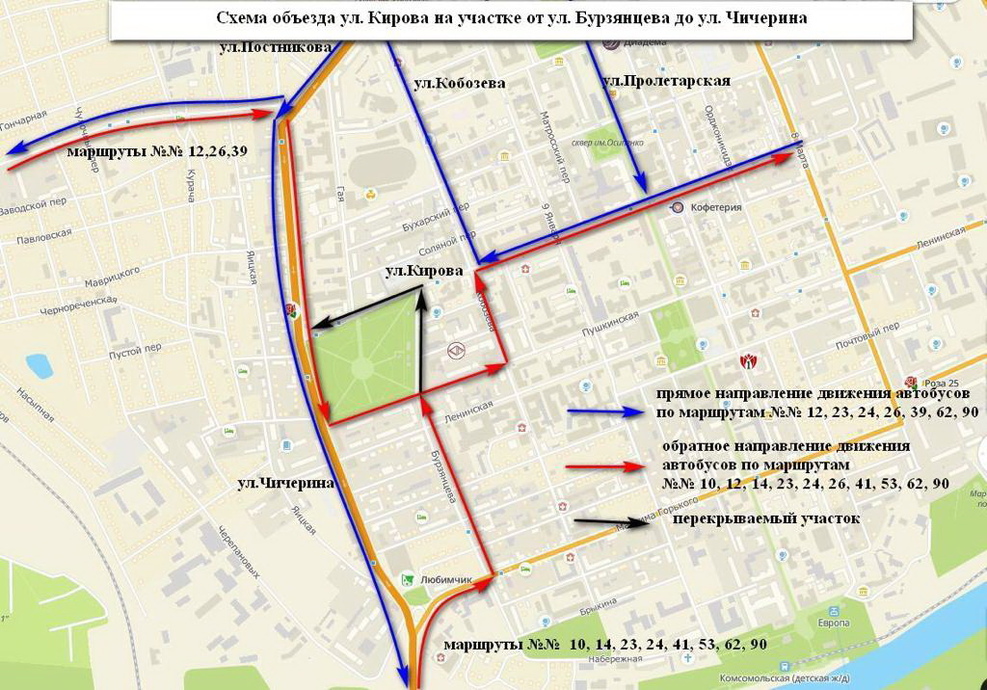 Движение транспорта будет прекращено на улице Кирова на участке от ул. Кобозева до ул. Чичерина, и на ул. Бурзянцева на участке от ул. Пушкинской до ул. Кирова. Участки перекроют сегодня вечером, в 22.00, закрытыми они пробудут до 30 апреля 2020 (также до 22.00).