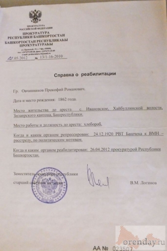 - Моего деда звали Прокофий Романович Овчинников, родился он в 1862 году, проживал в селе Ивановском Хайбуллинской волости Зилаирского кантона Башреспублики. Уголовное дело на него завели за то, что поднял вооруженный мятеж против продразверстки. На его подавление власти бросили карательный отряд.