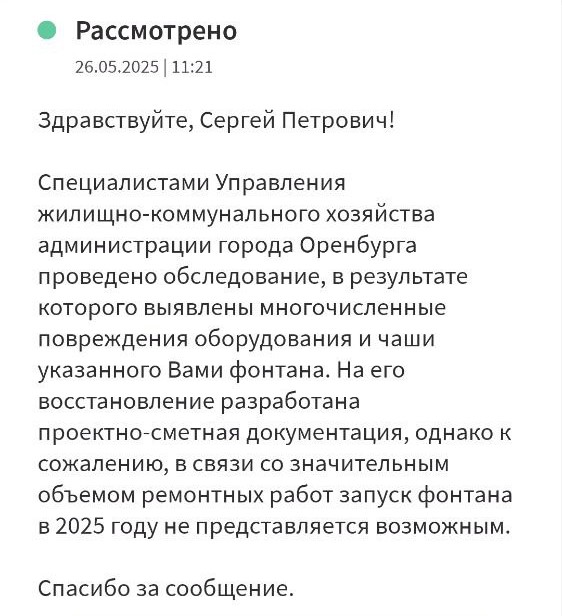Как сообщили чиновники в ответ на обращение оренбуржца по поводу неработающего фонтана, в этом году запустить его нет возможности.
