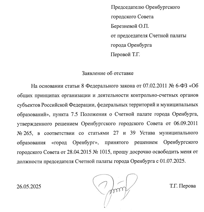 Татьяна Перова 26 мая написала заявление об отставке. Она попросила досрочно освободить ее от должности с 1 июля текущего года.