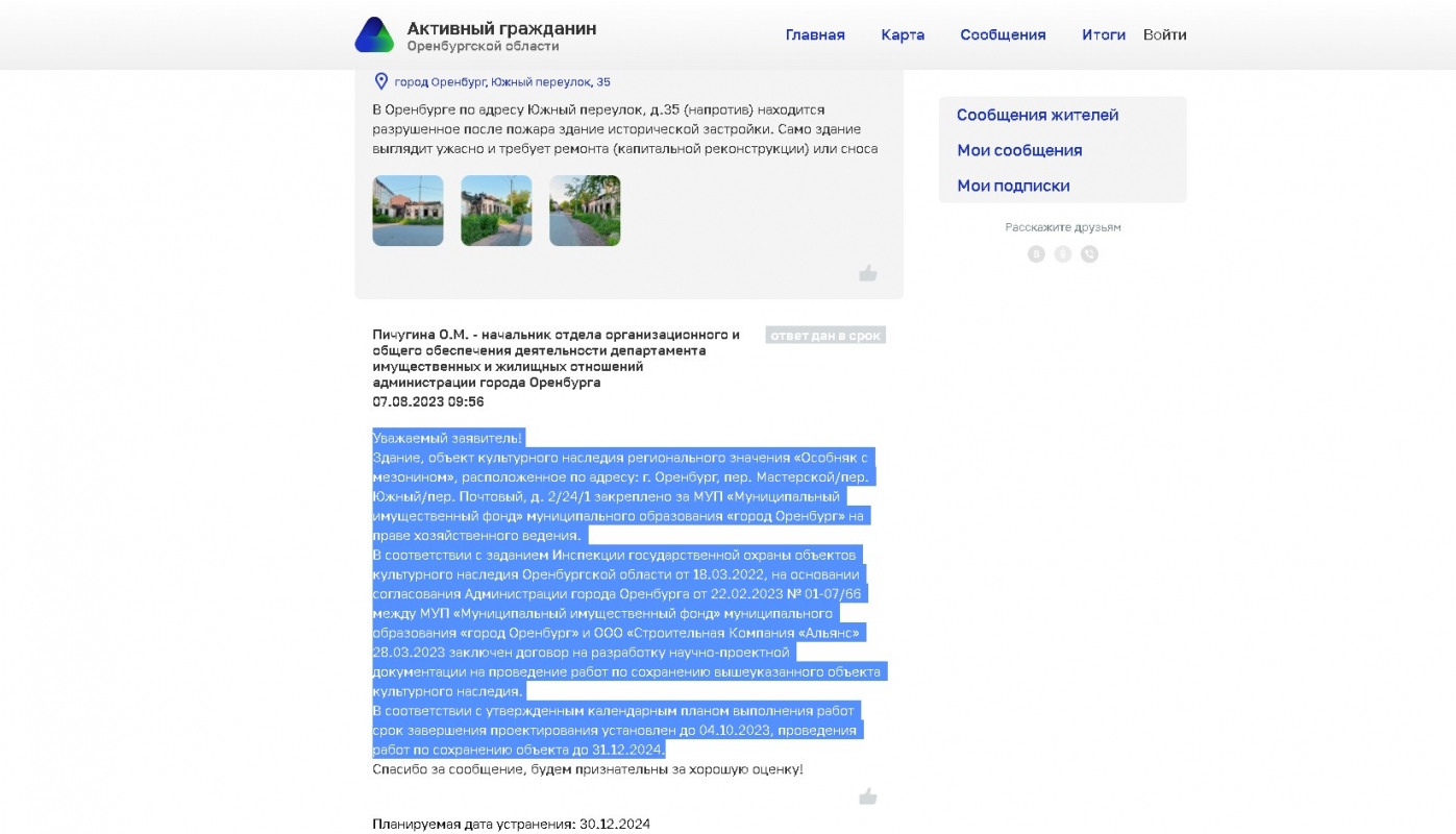 Как видите, ни проекта, ни начала, ни конца работ по сохранению ОКН не случилось. Оrenday направил запрос в муниципальный имущественный фонд Оренбурга, но ответа до сих пор не получено. Как оказалось, учреждение на данный момент находится на стадии ликвидации.