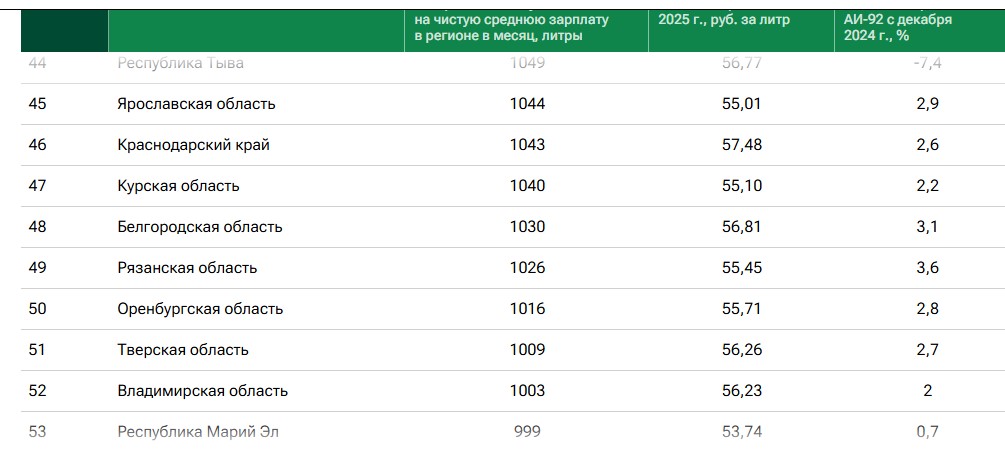 Для сравнения лидирует в рейтинге Ямало-Ненецкий автономный округ, где средняя зарплата может покрыть покупку 2653 литров топлива. Далее следуют Москва (2506 литров) и Чукотский автономный округ (2425 литров).