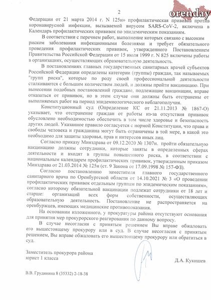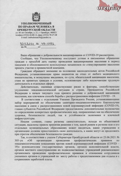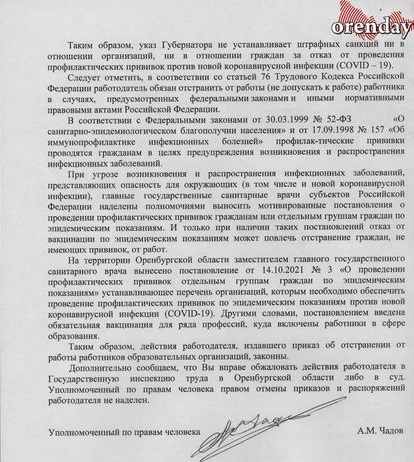 Уполномоченный по правам человека в Оренбургской области А.М. Чадов отреагировал на обращение учителей, но нарушений в действиях руководства школы не нашел, о чем и был дан официальный ответ: «На территории Оренбургской области заместителем главного государственного санитарного врача вынесено постановление от 14.10.2021 №3 «О проведении профилактических прививок отдельным группам граждан по эпидемическим показаниям» устанавливающее перечень организаций, которым необходимо обеспечить проведение профилактических прививок по эпидемическим показаниям против новой коронавирусной инфекции СOVID-19. Другими словами, постановлением введена обязательная вакцинация для ряда профессий, куда включены работники в сфере образования.