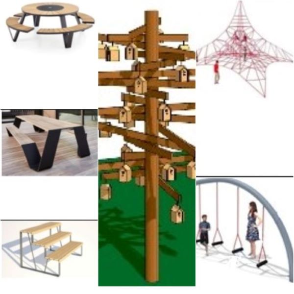 Это: ремонтная станция для велосипедов; информационные таблички и пилоны; металлические мангалы-барбекю и стальные урны для пепла и угля; столы деревянные и металлические; многочисленные скамьи разных форм; спасательную вышку; питьевой фонтан; велопарковку; стальные арт-объекты в виде оленей высотой от 1,2 метра до более чем двух метров; 6-метровый арт-объект в виде дерева со множеством скворечников; теневой навес из дерева и стали; пляжную раздевалку; туалетный модуль; разнообразные урны металлические и деревянно-стальные; контейнерный шкаф и откидной мусорный контейнер; торговый киоск; качели нескольких видов; архитектурные формы из каната; игровые сетки; арку; батуты; 11 спортивных тренажеров; четыре спортивных комплекса; брусья; боксерскую стойку; гамаки; остановку с подсветкой из стали, дерева и стеклопластика; ворота для мини-футбола; архитектурные формы, напоминающие конусообразные бокалы.