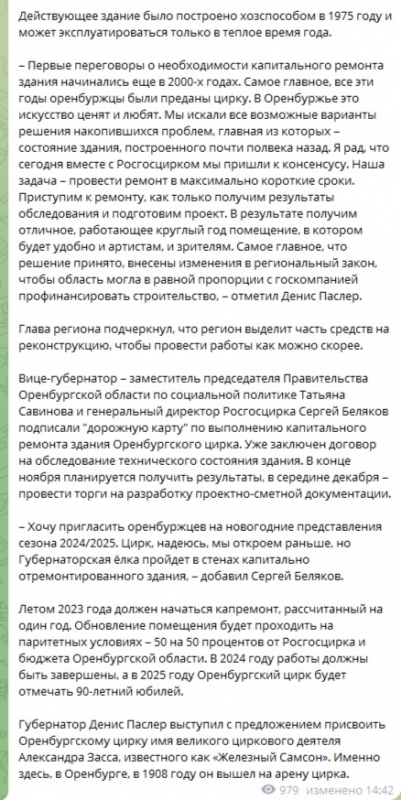 Разработку проектно-сметной документации на капитальный ремонт Оренбургского цирка осуществляет индивидуальный предприниматель Григорьев Максим Юрьевич. Перечень предстоящих работ в рамках капитального ремонта здания будет определён после прохождения государственной экспертизы разрабатываемого проекта. Капитальный ремонт планируется завершить в 2028 году, - сообщили Orenday в Росгосцирке.