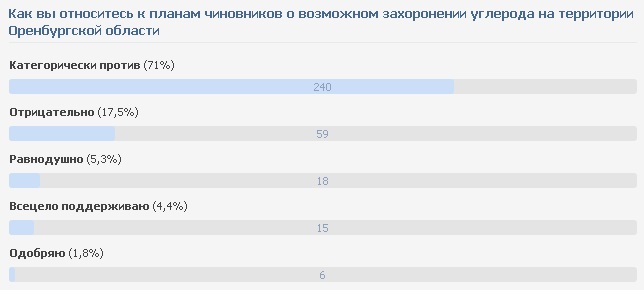 Orenday провел опрос и выяснил, как оренбуржцы относятся к планам чиновников по поводу возможного захоронения диоксида углерода на территории области. Итоги таковы: 71% опрошенных категорически против этого, 17,5% относятся к идее отрицательно, 5,3% относятся равнодушно, и лишь 1,8% одобряют и 4,4% «всецело поддерживают».