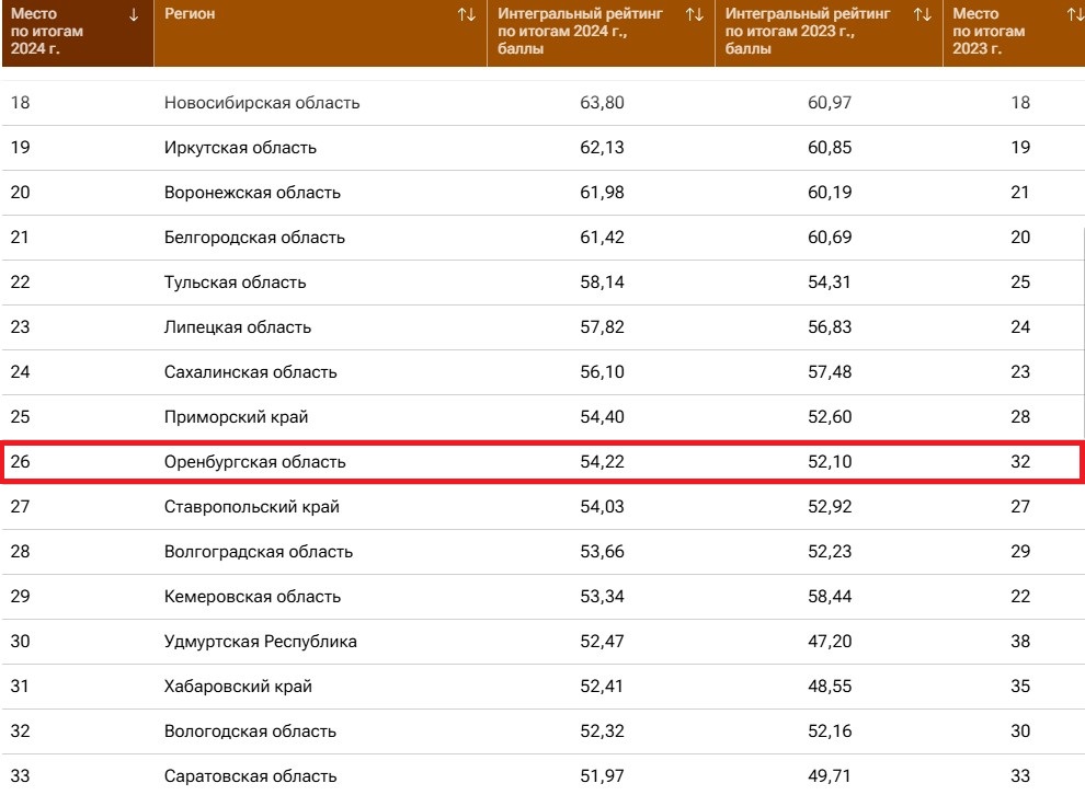 Степной край занял 26 место в рейтинге российских регионов по социально-экономическому положению. Список по данным Росстата, Минфина России, Федерального казначейства, Единого портала бюджетной системы РФ, Банка России составили эксперты Центра экономических исследований «РИА Рейтинг» на основе анализа ключевых показателей регионального развития. По итогам 2024 года Оренбургская область набрала 54,22 балла.