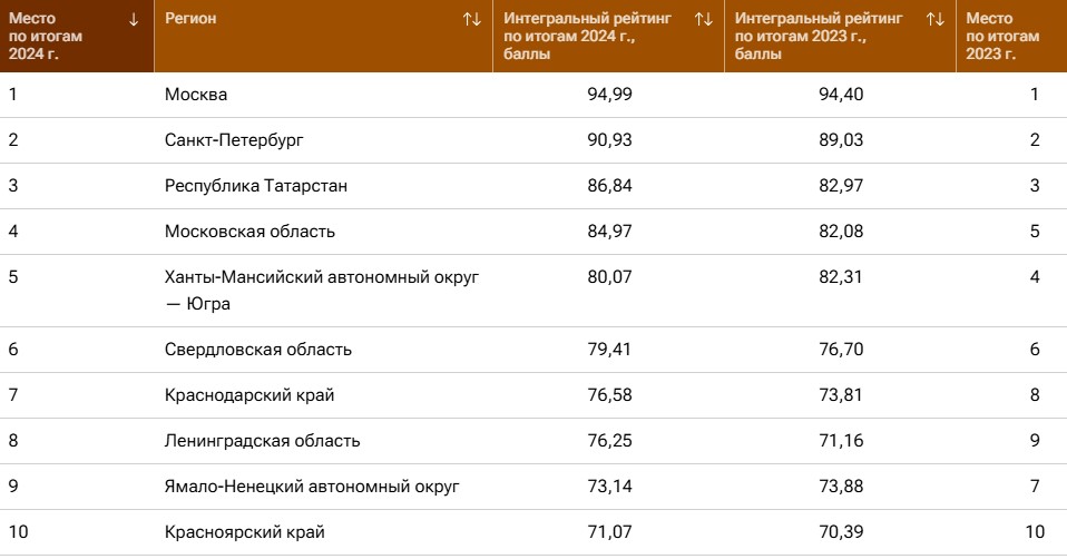 Первые места в списке традиционно заняли Москва, Санкт-Петербург и Республика Татарстан, Московская область и Ханты-Мансийский автономный округ — Югра с интегральным рейтингом от 80,07 до 94,99 балла.