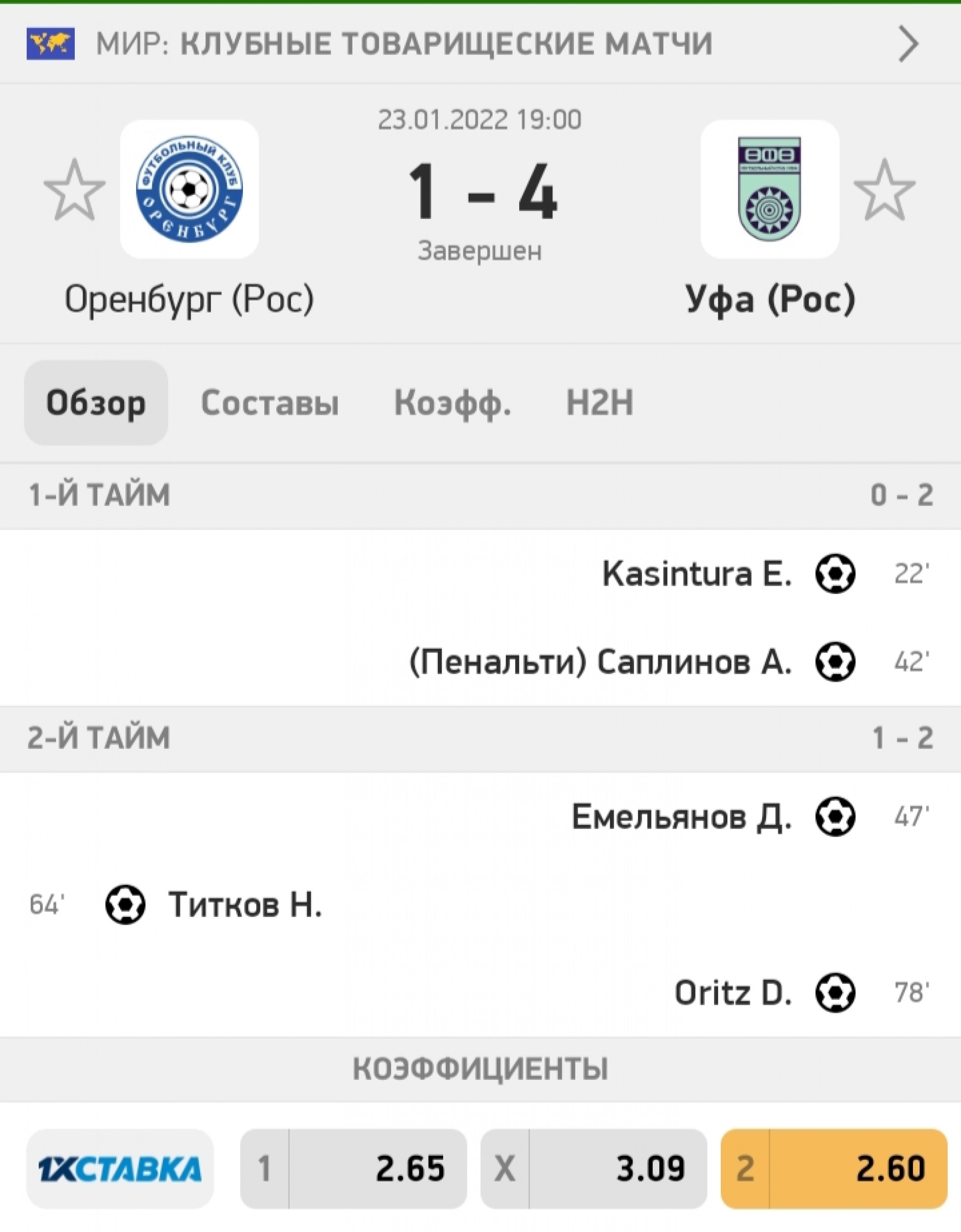 В самом начале второго тайма счёт довел до крупного Данила Емельянов - 0:3. На 64-й минуте разрыв сократил Николай Титков, но от крупного поражения "Оренбургу" уйти не удалось - итоговый счёт установил колумбийский новичок "Уфы" Дилан Ортис - 1:4.