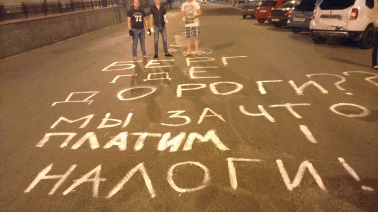 Ребята заранее накупили банки с краской и щетки, а затем отправились искать ямы на дорогах. Больше всего надписей оказалось на улице Кирова и на проспекте Победы. Возле Гостиного двора помимо обведенных ям и колдобин, прямо посреди проезжей части красуются надписи: «Ямы в цвет» и «Мы за что платим налоги?!».